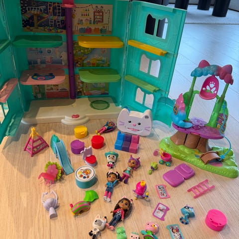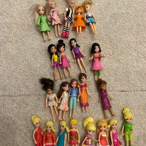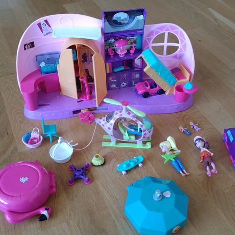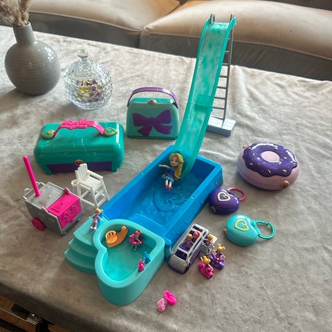 Polly Pocket lekesett med flere små dukker, kjøretøy, byggesett og tilbehør. Bildene viser blant annet et slott/bygning med rampe, en rosa bil, bassengområde med sklie og flere figurer, samt en større mengde klær og smådeler som kan brukes til å kle på dukkene og variere lekemiljøene. Settet består av plastdeler i ulike farger og inkluderer både figurer og løst tilbehør som kan kombineres på forskjellige måter i leken.
