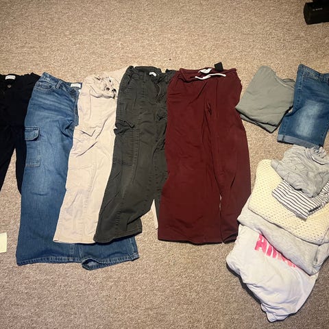 Selger liten klespakke med 4 bukser og 1 tynn vår/ sommerjakke.