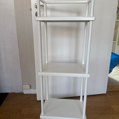 Baderomsmøbelsett med åpen hylle og benk i tre. Hyllen har flere åpne hyllenivåer med spiler som gir god lufting rundt innholdet. Benken har matchende spilekonstruksjon og kan brukes både som sittebenk og oppbevaringsløsning. Passer på bad eller andre rom der det er behov for enkel og luftig oppbevaring.