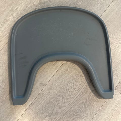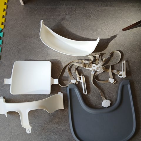 Stokke spisebrett til barnestol med sele i hvit plast. Spisebrettet festes på barnestolen for å gi barnet en egen spise- og lekeflate. Selen bidrar til å holde barnet sikkert på plass i stolen. Passer til bruk ved måltider og aktiviteter ved bordet.