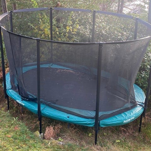 Pen og lite brukt North trampoline (oval), ca 3x5 m selges. Trampolinen er brukt sesong 2020-2024. Ikke brukt/ satt opp i 2025.