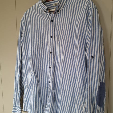 Marks & Spencer skjorte for herre i størrelse S. Skjorten er i blått stripemønster og er laget av bomull (pure cotton). Langermet modell med krage og knappelukking foran.