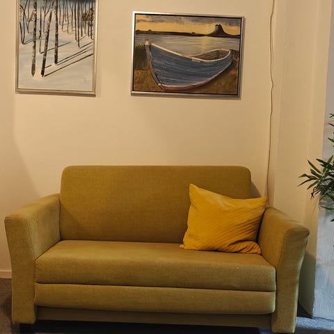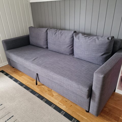 Nesten ny liten sovesofa. Liten og enkel. Når den dras ut er lengden 190 cm