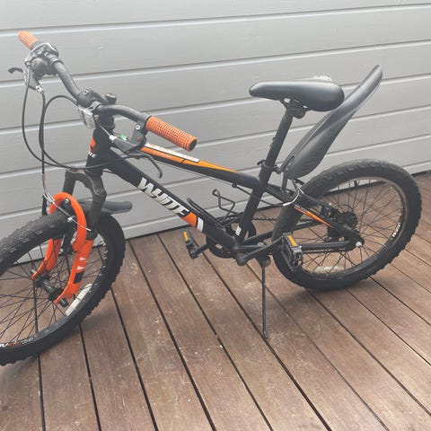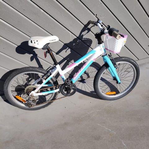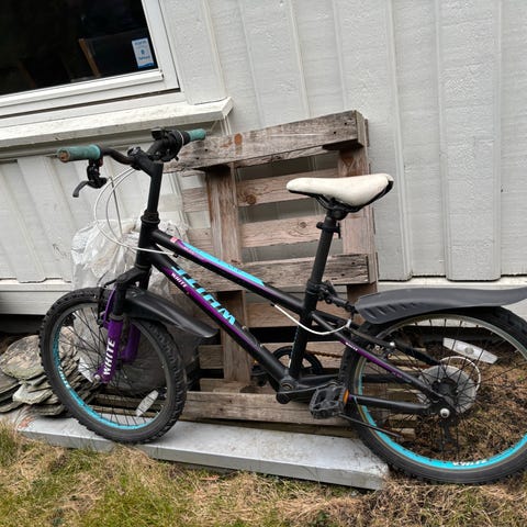 White barnesykkel 20" med gir og felgbremser. Sykkelen har svart ramme med turkise og lilla detaljer, hvitt sete og turkise holker på styret. Utstyrt med flere gir betjent via dreiegir på styret og kjedegir bak. Passer til barn som trenger en 20-tommers sykkel til hverdagssykling og turer på asfalt og lett grus. Enkel og funksjonell barnesykkel med standard pedaler og dekk tilpasset variert underlag.