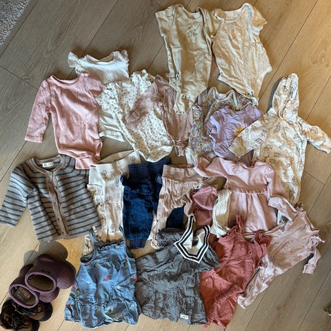 Klespakke barneklær for jente i størrelse 74/80, flerfarget. Pakken inneholder ulike plagg som bodyer, bukser, kjoler eller skjørt, pysjer/nattdrakter