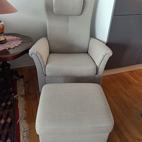 2 stk lenestoler m/puff fra Brunstad i lys brun/beige farge selges. Prisen er for begge stolene samlet. Må hentes i Grimstad. Pris kan diskuteres