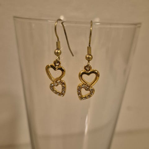 2 søte hjerteanheng i gullbelagt materiale med hhv. hvit og rød stein. Ikke edelstein, derfor rimelig pris på disse.