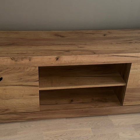 TV benken er i god stand. Skapdører på høyre og venstre side. Disse lukkes med magnet.