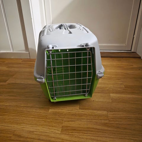 Selger pent brukt resisebur med to skåler, en keramikk og 1 metall skål. Reiseburet passer en liten katt, kanin- smådyr.