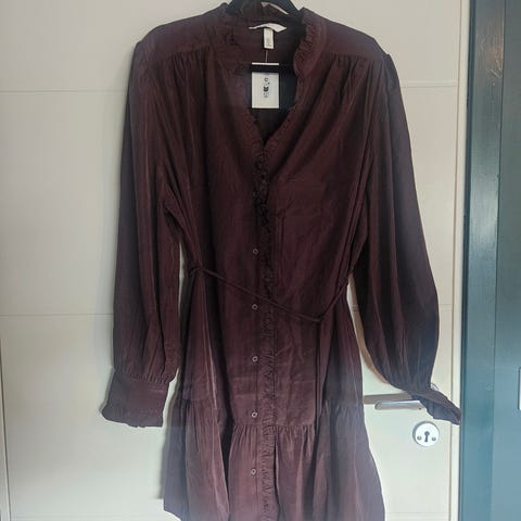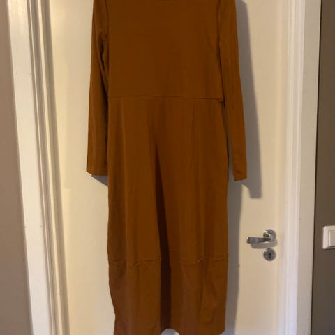 HM kjole i brun farge i størrelse L for dame. Kjolen er laget hovedsakelig av polyester med noe elastan, som gir et lett elastisk og strukturert materiale. Modellen har et langt snitt og teksturert overflate, egnet til både hverdag og enklere penere anledninger. Materialet er lett og faller nedover kroppen. Vaskes med lignende farger etter anvisning på vaskelappen.