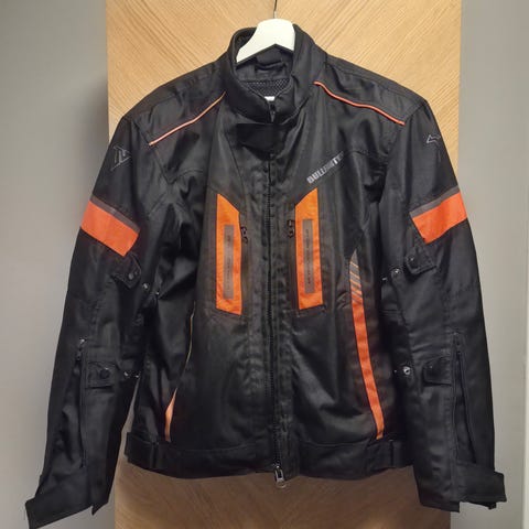 Mc jakke og bukse sett i tekstil med svart hovedfarge og oransje detaljer på jakken. Jakken har høy krage, justeringsmuligheter i ermer og liv, samt flere glidelåslommer og ventilasjonsåpninger. Refleksdetaljer gir økt synlighet. CE-godkjente beskyttere i henhold til PrEN1621-1 er integrert i plagget. Bukse med seler, glidelås og justering i livet, samt forsterkede partier på knær.