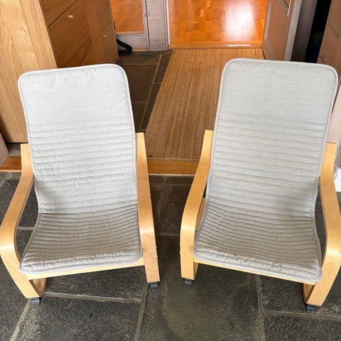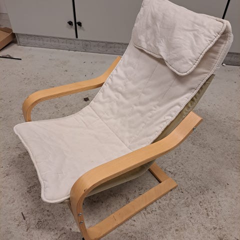 IKEA lenestol til barn. Stol med lys trestruktur og polstret sete- og ryggpute i lys tekstil. Egnet som sittemøbel for barn på barnerom, lekerom eller stue. Utformet for å gi støtte til rygg og armer når barnet sitter og leser, slapper av eller ser på skjerm.