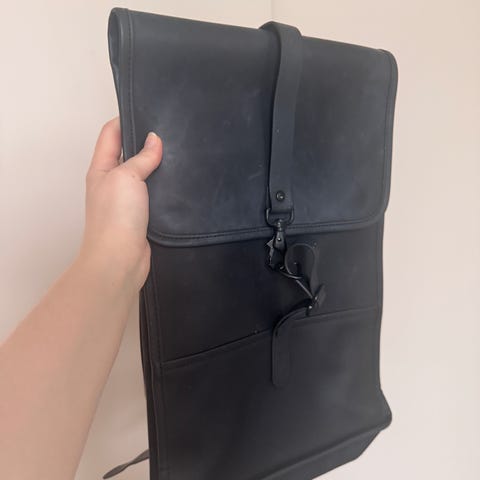 Rains ryggsekk i plastmateriale for unisex. Sekken har klaff med to stropper og spenner i front, justerbare skulderremmer og bærehank på toppen. Hovedrommet åpnes under klaffen og gir plass til daglig utstyr som bøker, klær eller mindre elektronikk, med en egen laptop-inndeler. Overflaten er glatt og vannavvisende, egnet for bruk i hverdagen og på korte turer i variert vær. Farge: svart.