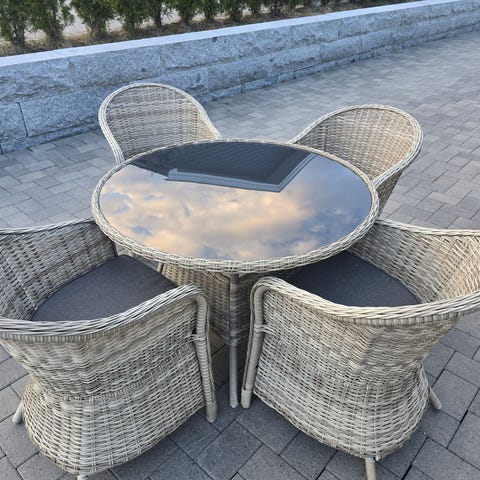 Rundt hagebord med fire tilhørende stoler i brun kunstrotting. Bord og stoler er laget for utendørs bruk, for eksempel på terrasse, balkong eller i hage. Stolene har buet rygg og armlener for mer omsluttende sittekomfort. Settet passer til spiseplass ute og gir sitteplasser til fire personer rundt bordet.