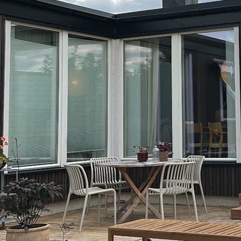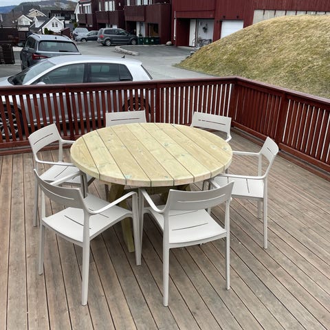 Ekstra stol fås med, men denne har skade på rygg. Fungerer fint.