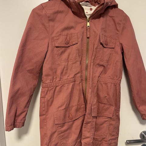 Kul og fin parkasjakke for jente i størrelse 134. Jakken er grønn og laget i bomull. Modellen er unisex og har glidelåslukking foran. Den har hette og lommer foran, samt mønstret fôr på innsiden. Passer til hverdagsbruk i overgangssesonger.
