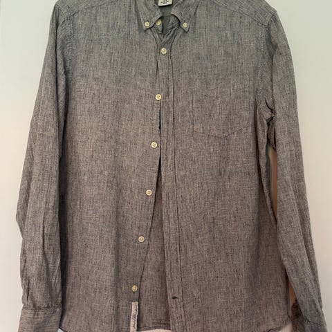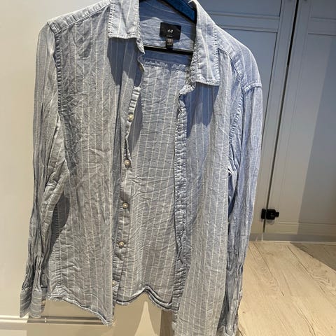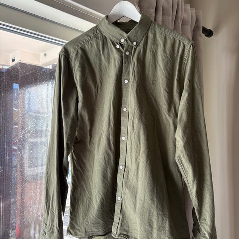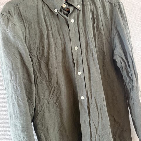 H&M skjorte for herre i størrelse M. Skjorten er grønn og laget i 53 % lin og 47 % bomull. Den har lange ermer, knappestolpe foran og krage uten slag (ståkrage).