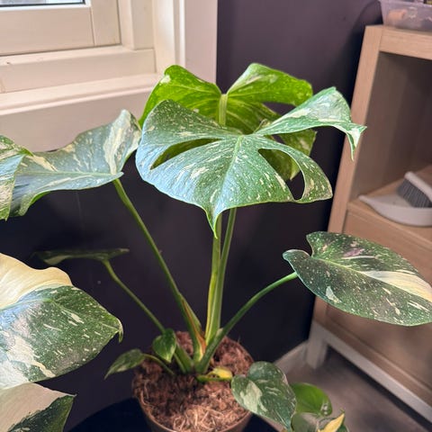 Monstera variegata, hvite variegerte felter. Selges med innerpotte(den gjennomsiktige), står i koko coir og perlite. Trives med lys, jevn vanning og noe luftfuktighet. Bør gis en mosestokk så den kan klatre, du kan ta stikling av denne og potte to i samme for fyldigere plante.