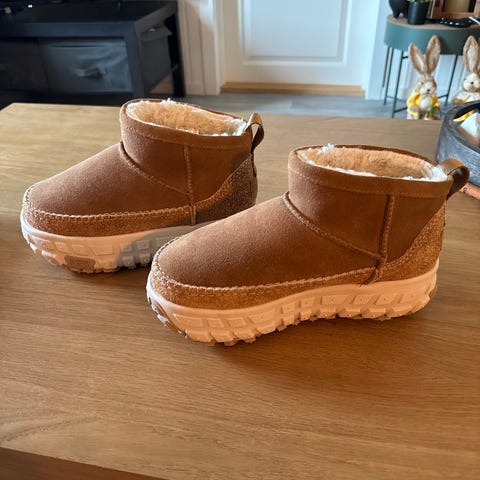 Selger et par svært populære UGG Classic Ultra Mini i utgaven med Platform-såle. Dette er den mest ettertraktede modellen akkurat nå, kjent for sin lave kant og den tykke, stilige sålen som gir både ekstra høyde og god demping.
