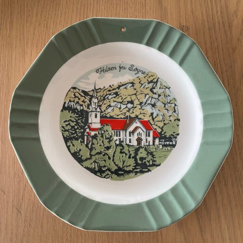 Porselenstallerken med bymotiv i blå og brune toner. Motiv av klassiske bygninger, vann og trerekke langs en promenade. Tallerkenen har oppheng på baksiden for bruk som veggdekor. Egner seg som dekorativ tallerken i stue, kjøkken eller gang. Merking på baksiden.