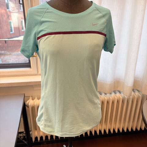 Nike Dri-FIT løpetrøye for dame i størrelse S. T-skjorte med korte ermer i gul farge, laget i pustende, fukttransporterende materiale med meshfelt for bedre ventilasjon. Egnet til løping og annen trening.