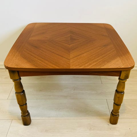 Nydelig liten taburett i teak med polstret sete (nytt trekk i vevd stoff) og messingdetaljer.