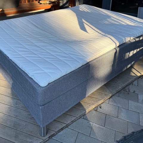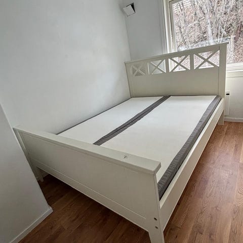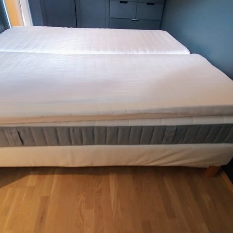 2 år gammel seng, brukt som gjesteseng. Medium madrass. Selges med overmadrass.