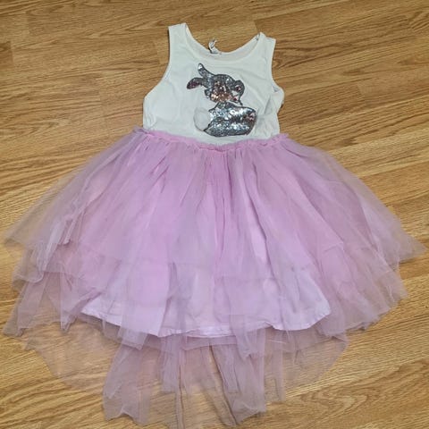Nydelig kjole i lys rosa farge med blondedetaljer. Står str 7 i den, men vil si den passer best str 116.