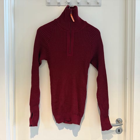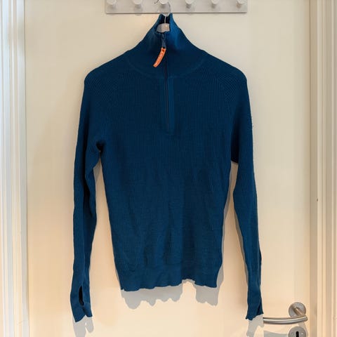 Lanullva T-skjorte Eksklusiv serien for dame i størrelse M. T-skjorten er marineblå og strikket i merinoull. Modellen har korte ermer, rund hals og glidelås i nakken. Ribbestrikket felt i siden. Ribbestrikkede kanter nederst og på ermene, samt diskret metallogo nederst på plagget. Passer som lett ulltopp til hverdagsbruk eller som mellomlag.