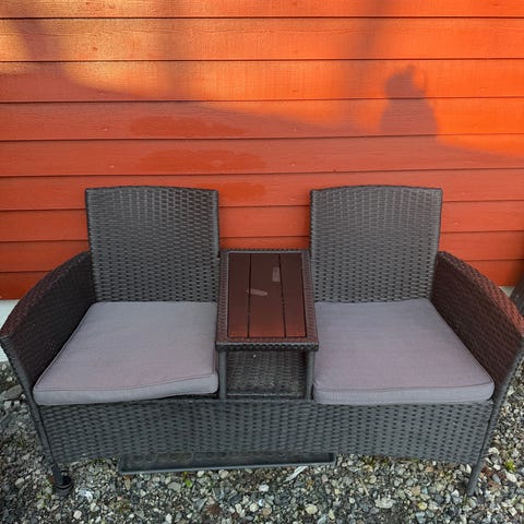 Toseter hagebenk med integrert bord i midten i grå kunstrotting. Benken har to separate sitteplasser med høye ryggstøtter og armlener på sidene. Bordet i midten har plate i treimitasjon. Understellet er i metall med flettet kunstrotting rundt. Møbelet er egnet for utebruk på terrasse, balkong eller hageområde, og gir en fast sitteplass for to personer med praktisk avlastningsbord mellom setene.
