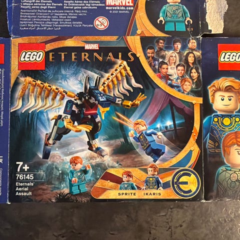 LEGO Infinity Gauntlet modell. Sett som forestiller den gylne hansken med seks fargede steiner, montert på en liten utstillingssokkel. Leveres med hefte med illustrasjoner og informasjon om modellen. Egnet som byggesett og utstillingsmodell for samlere og LEGO-interesserte.