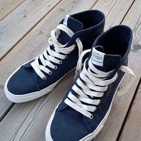 Stockholm Design Group sneakers/joggesko i størrelse 44. Modellen er en høy ankel-sneaker med blå overdel og lys såle. Skoene har lisser i kontrastfarge og flat gummisåle. Egnet som hverdagssko og fritidssko.