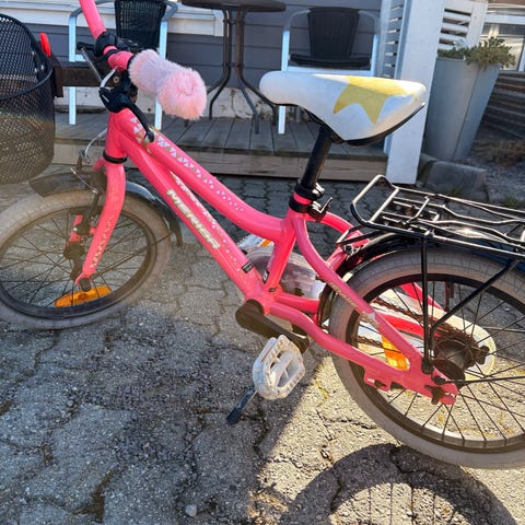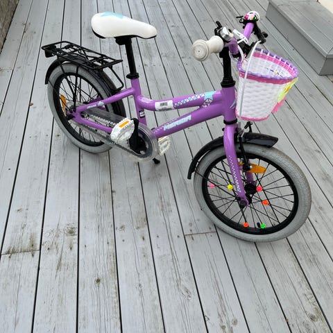 Barnesykkel med 20" hjul i lilla farge. Sykkelen har lav ramme som gjør det enklere å komme av og på, samt hvitt sete med mønster. Foran er det montert en flettet kurv i hvitt og rosa med blomsterdekor. Sykkelen har bremser foran og bak, samt reflektorer i hjulene. Passer til barn som trenger en sykkel med 20" hjulstørrelse til bruk på vei og sykkelsti.