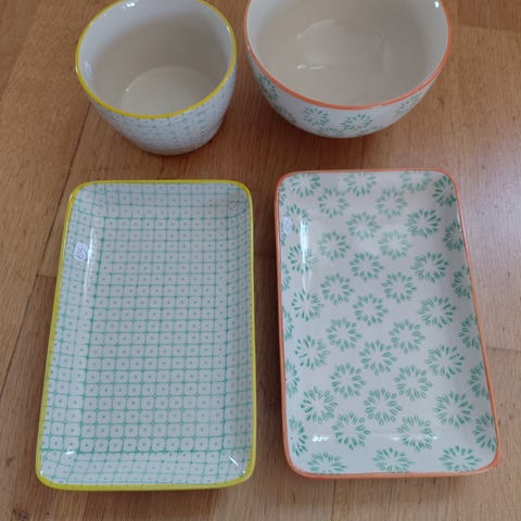Bloomingville skåler i keramikk. Settet består av to skåler med organisk form og glanset innside i ulike farger. Egnet til servering av snacks, tilbehør eller som små serveringsskåler på kjøkkenet eller bordet. Designet har en enkel og moderne stil som passer inn i mange typer serviser.