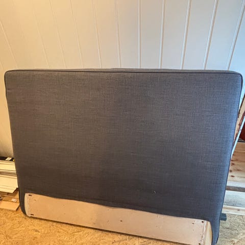 Enkel og nøytral sengegavl. Litt løs i stoffet.