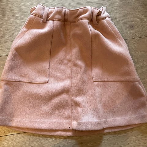 Rosa og hvitstripet sett, buksen har vide ben og strikk i livet med rysjer nederst. Fargen sees best på siste bilde
