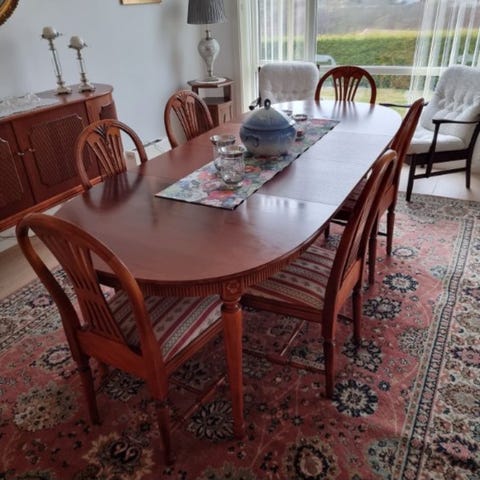 Noen merker på stolbena og litt under bordet. 2 plater som skyves inn under bordet. Lengde pr plate 60 cm totalt 3.20. Ellers ingen merker. Pris når kjøpt ny 30.000;-