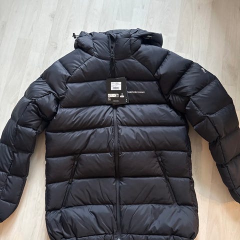 Peak Performance dunjakke for dame i størrelse S. Pent brukt men ett bittelite hull foran (se bilde), ellers veldig fin stand.