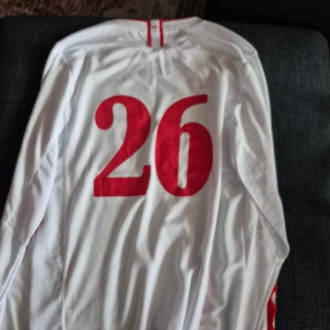 Helt ny Nike langermet fotballdrakt i svart og hvit med vertikale striper. Drakten har rund hals og er laget i et lett og funksjonelt materiale egnet for fotball og annen trening. Passer til bruk på trening eller kamp, samt som generelt sportstøy. Det var julegaven, men det var for lite. Så blir bare liggende i skapet.