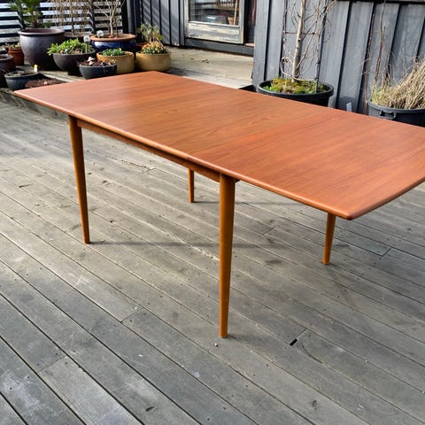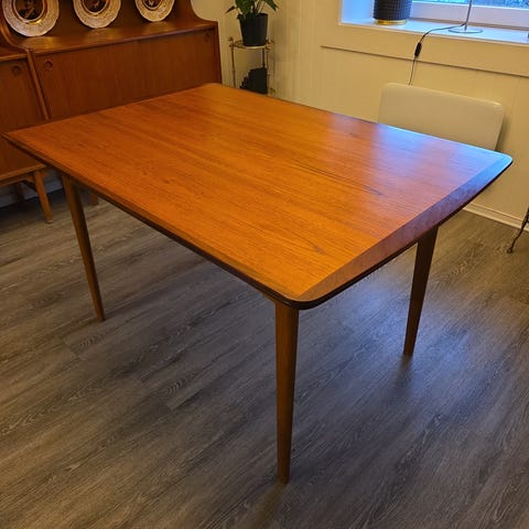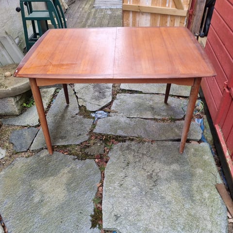 Pent brukt spisebord i treak. Klassisk og tidløst design med praktiske innleggsplater