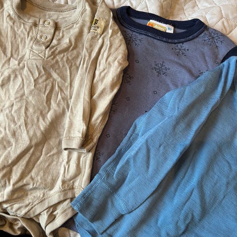 6 bodyer i god stand, kan være noen nupper. 1 bukse str 92 og hel med stopper i 92.