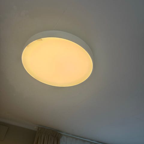 To stykk taklamper selges. Passer fint i gang/bod eller andre steder med ønske om godt lys. Lampene fungerer godt, vi byttet ut lampene grunnet oppussing/ny stil. Diameter 28cm.