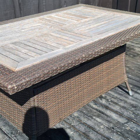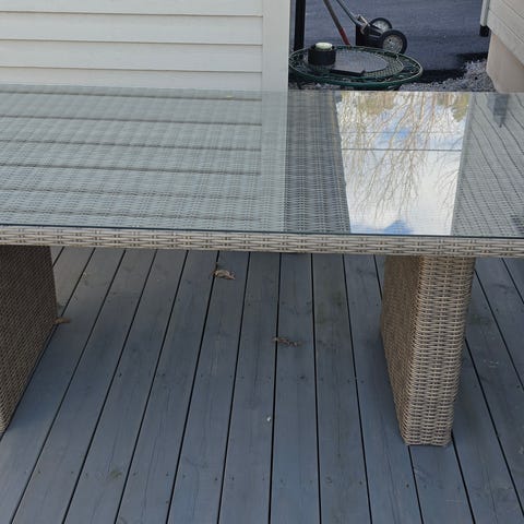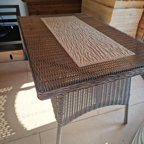 Hagebord med rektangulær bordplate i glass og understell i kunstrotting i brun/naturfarget tone. Bordet har flettet rottingramme med tette sideplater og tverrstang for ekstra stabilitet. Høyde 70 cm. Glassplaten ligger oppå rottingen og har avrundede hjørner. Egnet som spisebord eller avlastningsbord på terrasse, balkong eller i hage. Bordet er konstruert for utendørs bruk med materialer som tåler vær og vind ved normal bruk og vedlikehold.