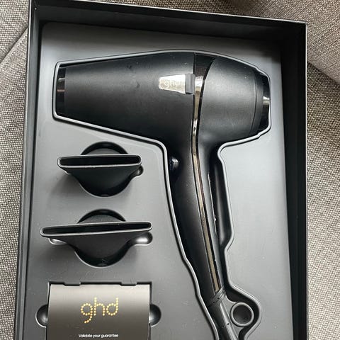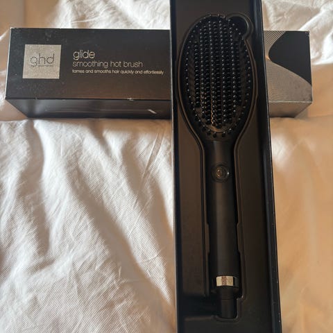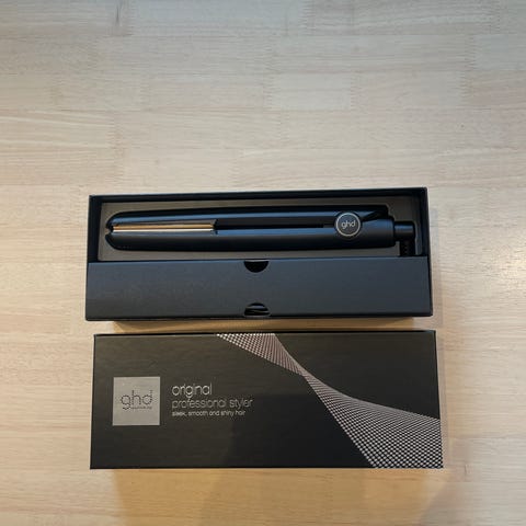 Lite brukt rettetang i god stand. Gift set, følger med hårbørste og veske til rettetang. I orginal eske.