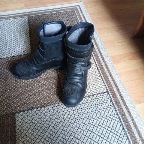 TCX Drifter WP mc-støvler i størrelse 45. Støvlene er høye med justerbare spenner og beskyttelsespaneler foran og på sidene. Fargekombinasjon brun og svart. Modellen er merket WP (Waterproof), og er laget for motorsykkelbruk med CE-merking i henhold til gjeldende standard. Overdelen er i slitesterkt materiale med forsterkninger ved girpedal og hæl. Sålen er grovmønstret for godt grep. Egner seg til bruk på vei og lett grus-/eventyrkjøring, og gir støtte og beskyttelse rundt ankel og legg.