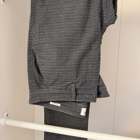 Stretch bukse for herre i størrelse M. Buksen er grå og laget hovedsakelig av polyesterblanding, med rett passform og hel lengde. Den har knapp og glidelås i front, samt sidelommer.