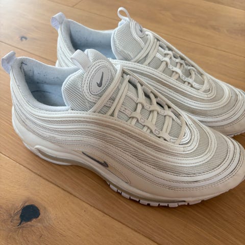 Selger et par stilige Nike Air Max 97 i størrelse 40,5. Klassisk design i beige/hvit med sorte detaljer – passer til det meste.