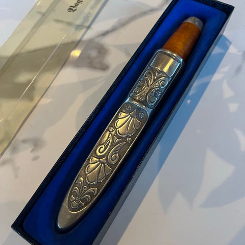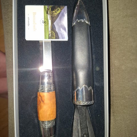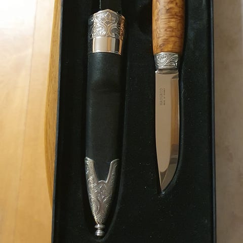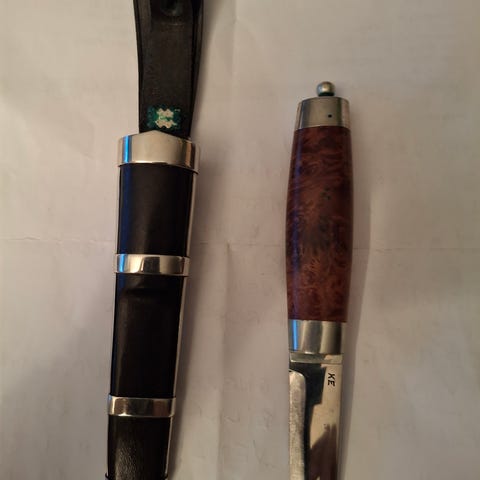 Lite brukt knib med slire i skinn og 925s. Haugrud kniv.