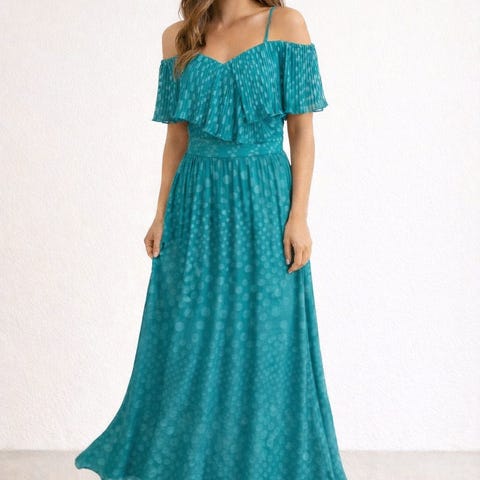 Kjolen har en eksklusiv struktur i stoffet med diskret mønster, høy hals og feminine detaljer. Den markerte midjen gir en veldig flatterende silhuett, mens skjørtet faller fint og elegant.