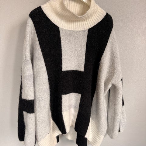 HÉST genser for dame i størrelse S. Strikket ullgenser med rund hals og mønster med store kontrastfelt i svart, grått og hvitt. Genseren har ribbestrikket hals, nederkant og mansjetter. Materiale i ull gir et varmt og mykt plagg som egner seg godt til hverdagsbruk og som lag over andre klær i kjøligere vær.